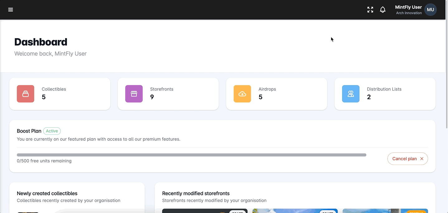 <table data-view="cards"><thead><tr><th></th><th></th><th data-hidden data-card-target data-type="content-ref"></th></tr></thead><tbody><tr><td><strong>Create a collectible</strong></td><td>Create your first digital collectible</td><td><a href="digital-collectibles/creating-collectibles">creating-collectibles</a></td></tr><tr><td><strong>Create a storefront</strong></td><td>Build your custom-branded MintFly storefront</td><td><a href="storefront/creating-storefronts">creating-storefronts</a></td></tr><tr><td><strong>Publish your storefront</strong></td><td>Go live and publish your storefront</td><td><a href="storefront/publishing-storefronts">publishing-storefronts</a></td></tr><tr><td><strong>Configure a distribution list</strong></td><td>Set up a distribution list</td><td><a href="airdrop/setting-up-distribution-lists">setting-up-distribution-lists</a></td></tr><tr><td><strong>Create an airdrop</strong></td><td>Build and design your airdrop</td><td><a href="airdrop/creating-an-airdrop">creating-an-airdrop</a></td></tr><tr><td><strong>Activate your airdrop</strong></td><td>Engage your customers with airdrops</td><td><a href="airdrop/activating-an-airdrop">activating-an-airdrop</a></td></tr></tbody></table>