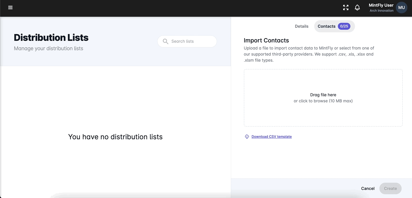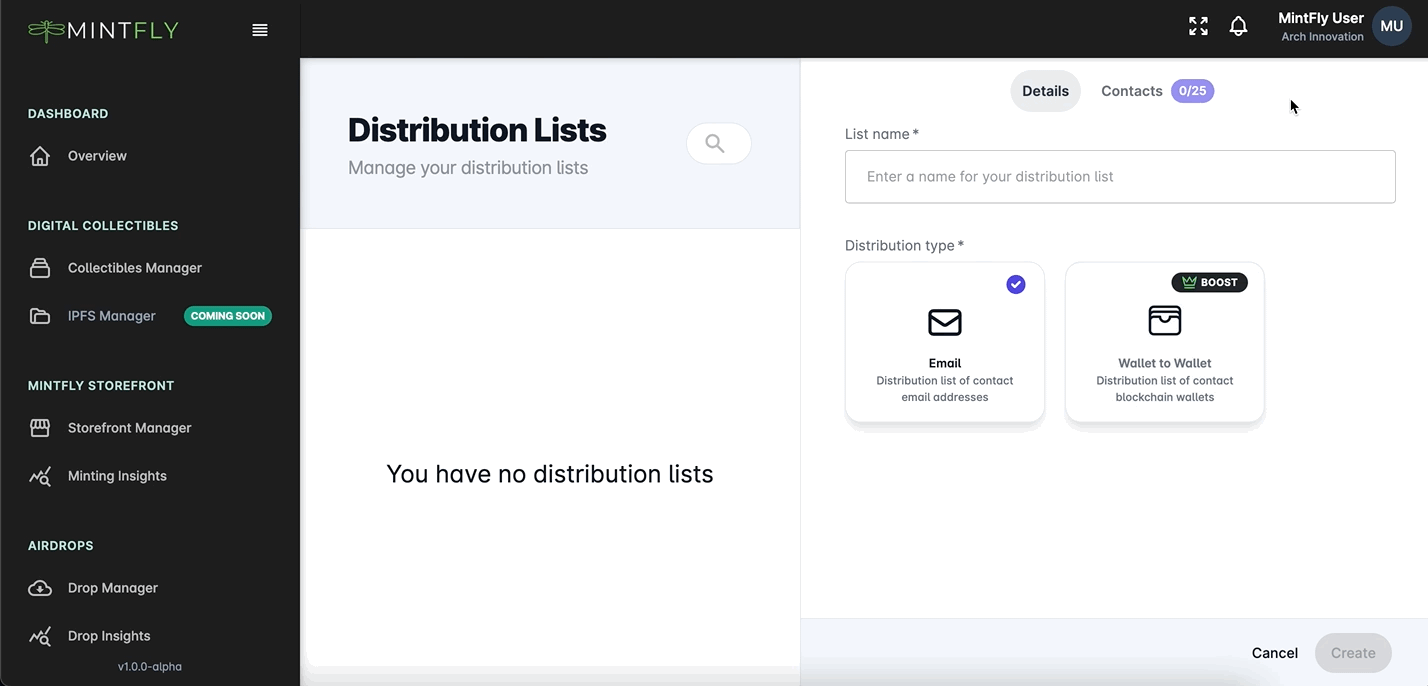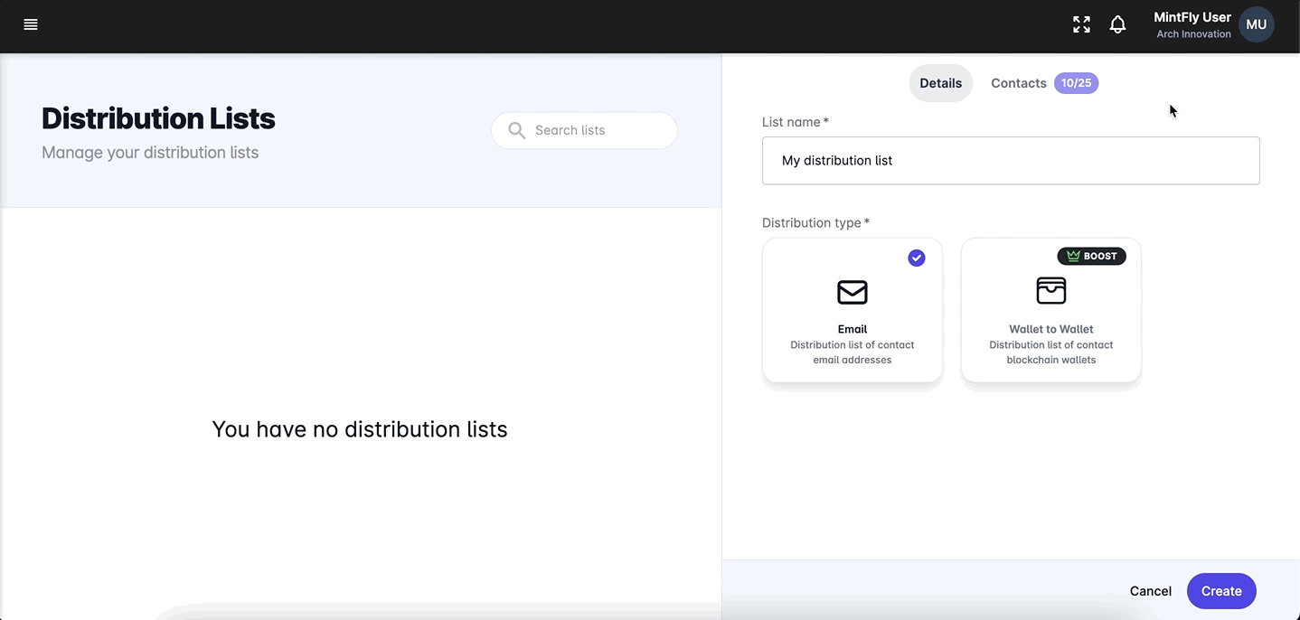 You can set up distribution lists within MintFly to store various groups of contacts and attach them to your airdrops for bulk distribution. These are perfect for categorizing your contacts or building specific lists for each campaign your organization runs.&#x20;