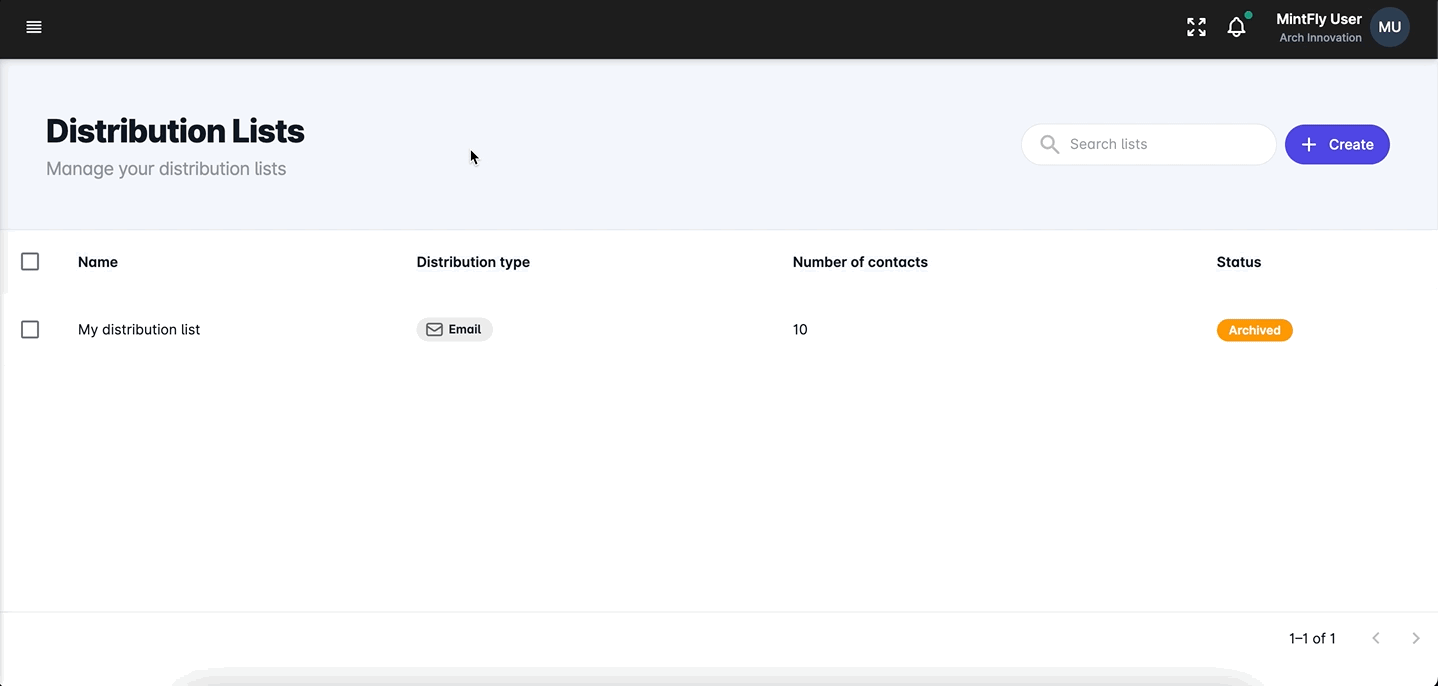 <figure><img src="https://3563393395-files.gitbook.io/~/files/v0/b/gitbook-x-prod.appspot.com/o/spaces%2F0UGlgF3AyVVSY2oO1Oq1%2Fuploads%2FaYjHvl08nm3rnRLSg25P%2Farchive-distro-list.gif?alt=media&#x26;token=9363cbbc-3bf8-4adc-a067-a18c7ba8271f" alt=""><figcaption><p>Archiving a distribution list</p></figcaption></figure>